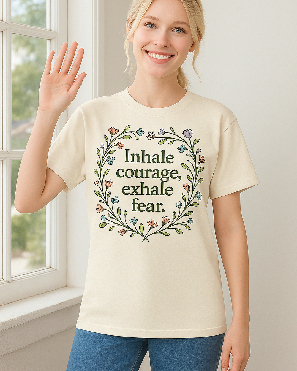 This Inhale Courage, Exhale Fear Comfort Colors 1717 tee is your wearable mantra for mindful living. Wrapped in a blooming floral frame, the quote is your gentle nudge to pause, center, and reclaim your peace — one breath at a time.